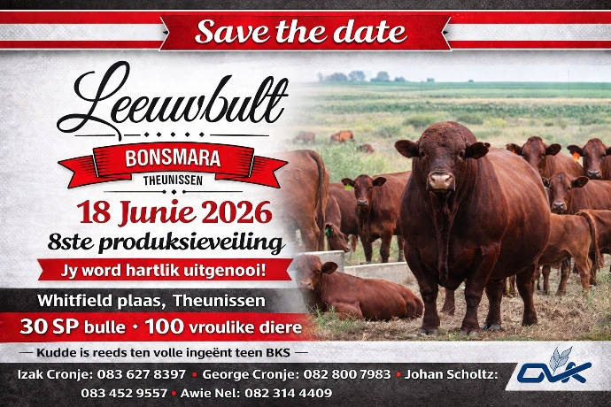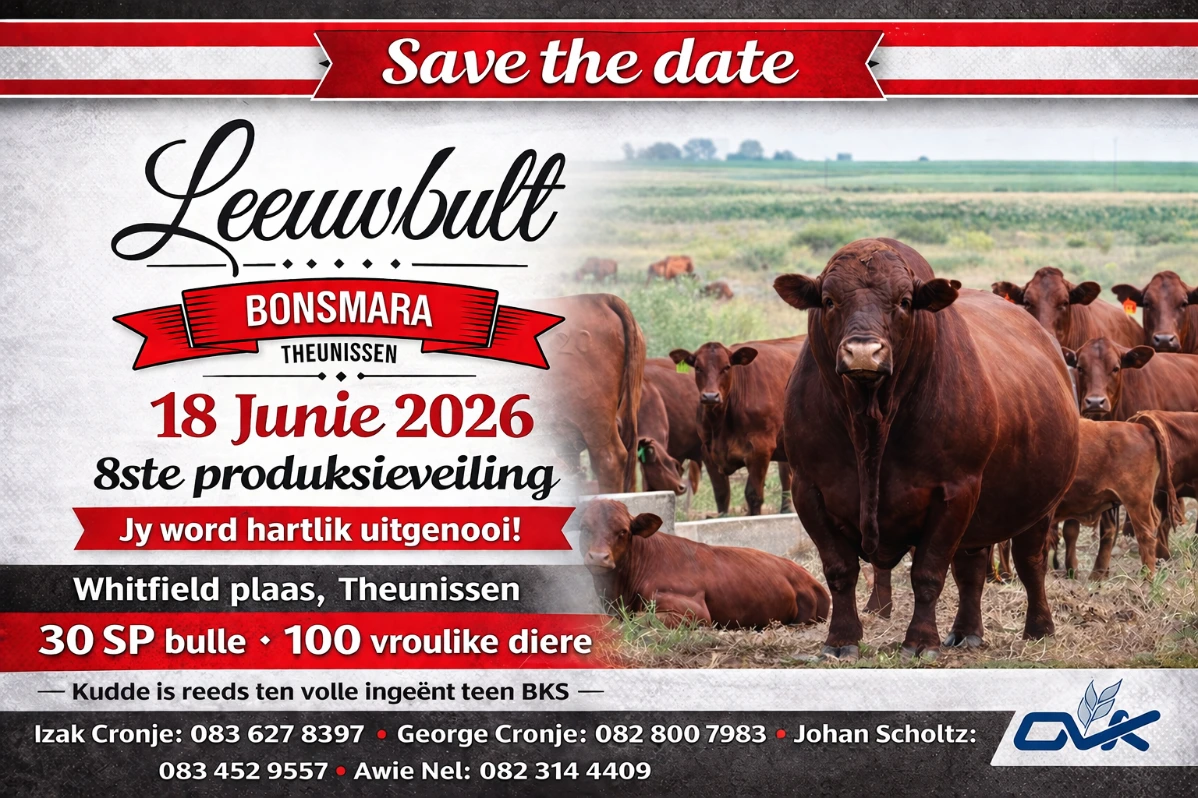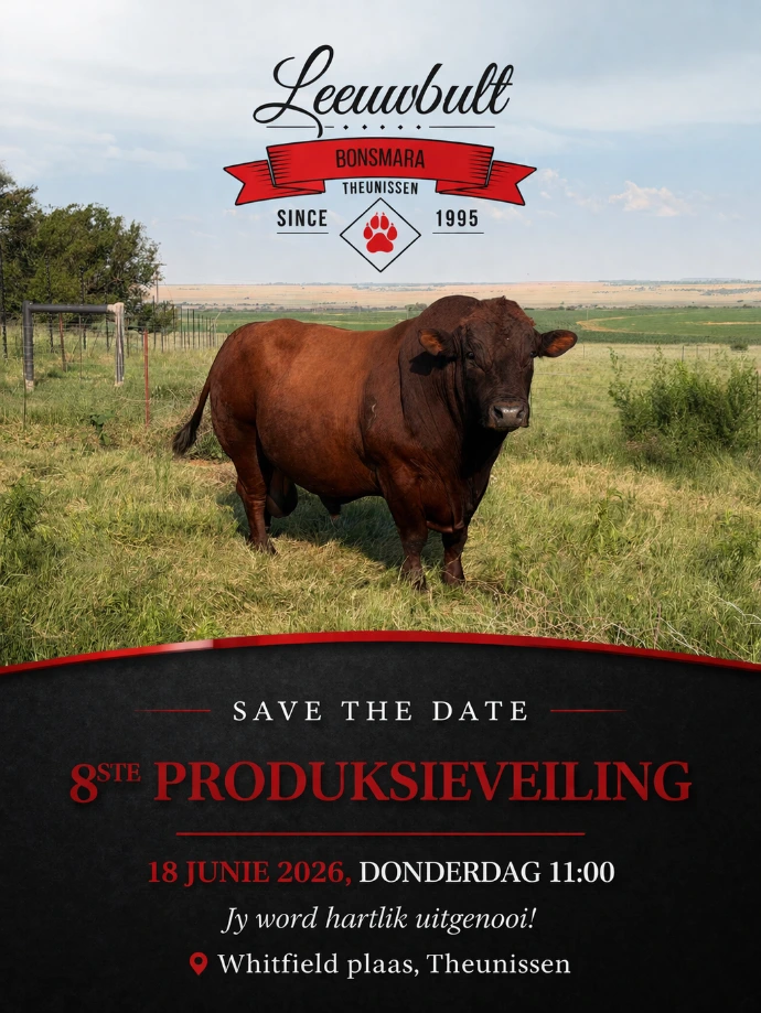 Elke jaar bring sy eie uitdagings, maar ook geleenthede om te verbeter, te verfyn, en te groei. Dis presies wat ons hier op Leeuwbult aanpak, en dis waarom ek jou graag wil nooi na ons produksieveiling op 19 Junie 2025. As jy op soek is na betroubare, prestasie-getoetste diere wat waarde gaan toevoeg tot jou kudde, dan is hierdie uitnodiging vir jou.
